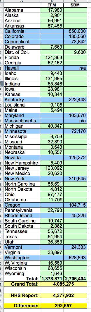 Done? OK, according to the HHS Dept., when you tally up all of the Medicaid/CHIP determinations in Column 5 from both pages, according to the report, the grand total are supposed to be 4,377,932.