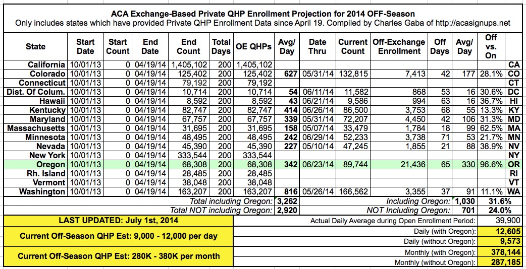 With the addition of some new enrollment data out of Kentucky and Minnesota, I've updated the Off Season QHP Enrollment chart. Note that the available data only includes states representing about 8% of the total enrollments nationally, and even some of those are only updated through early May, so the numbers will no doubt bounce around a lot as fresh numbers come in.