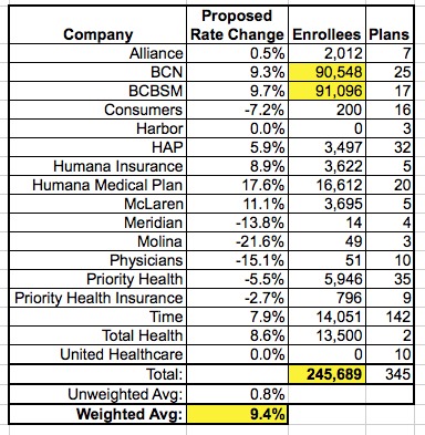 A couple of weeks ago, I posted an entry regarding the proposed rate change requests by the 17 insurance companies participating on Michigan's ACA exchange for 2015. The news at the time was a mixed bag, with some companies requesting rate increases of up to 18%, while others were requesting a reduction of their rates by 22%. Overall, according to the Detroit Free Press article, the average rate increase request is a mere 0.8%. Hooray!