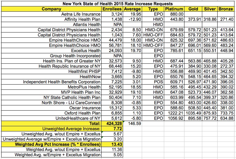 A week or so ago, I posted an entry about the requested rate changes for 2015 from the insurance companies operating on the New York exchange (I'm emphasizing "requested" since, again, those changes still have to be approved by state regulators, who have already lopped the average increases down dramatically in both Rhode Island and Connecticut, and I just announced that CA kept them to a quite reasonable 4.3% (weighted) average). The overall unweighted average requested change in New York appeared to be 14.6% increase, which isn't good news at all.