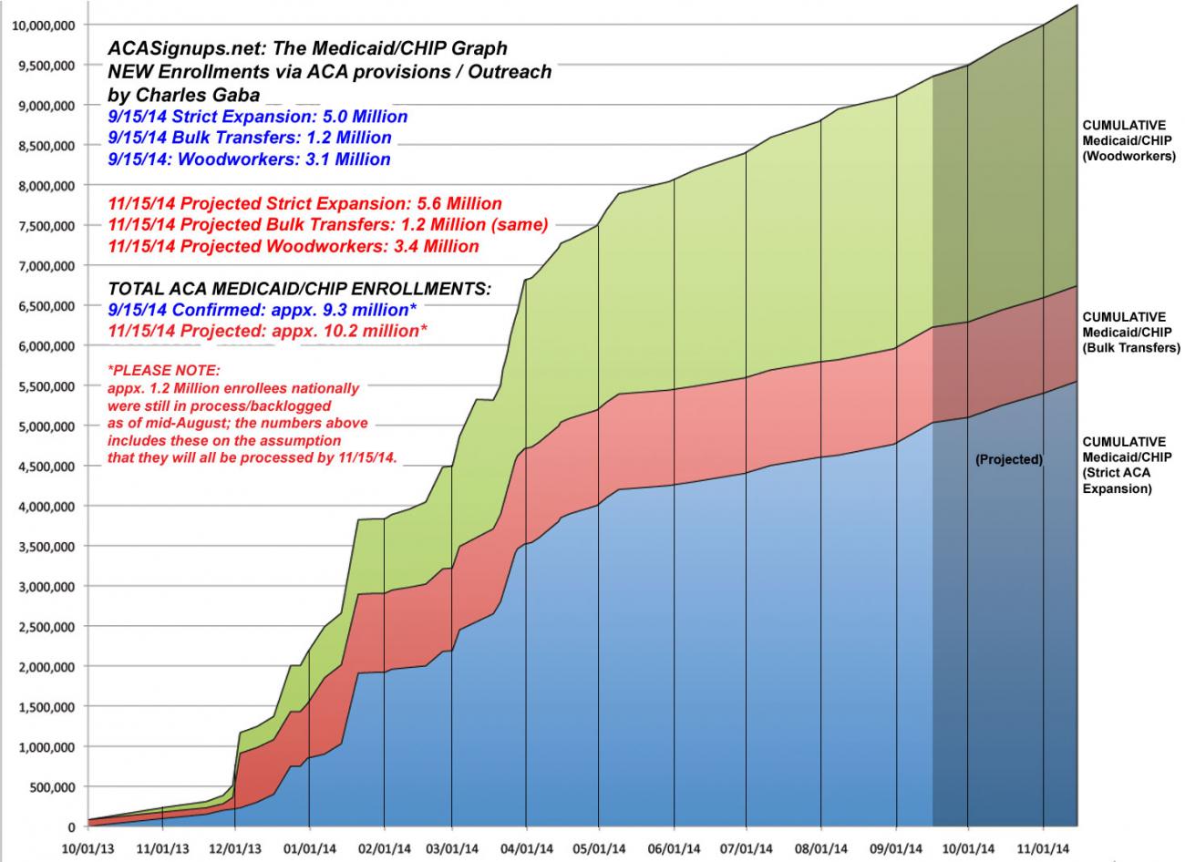 Now I've added the other half of the revamped graph: ACA-enabled Medicaid/CHIP enrollments.  Like the QHP graph, there are 3 color-coded sections, but in this case they represent "Strict ACA Expansion" (people who are only eligible for Medicaid/CHIP due to the income provisions within the law in half the states); "Bulk Transfers" (ie, transferred from existing state-run programs such as LIHP in California, Commonwealth Care in Massachusetts, etc. due to ACA provisions) and "Woodworkers" (people who were already eligible for Medicaid prior to the expansion provisions, but who never enrolled before due to either being unaware of their eligibility, not understanding the process, etc). "Woodworkers" are folks who have been "drawn out of the woodwork" since last October thanks to a robust outreach program by the government and affiliated nonprofits, as well as a streamlined enrollment process and other measures.