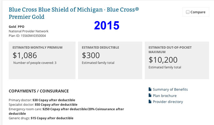 • I've already plugged in my own family's current BCBSM policy to compare it against 2014. In our case, the full price (without any tax credits) has gone up by 7.4%: