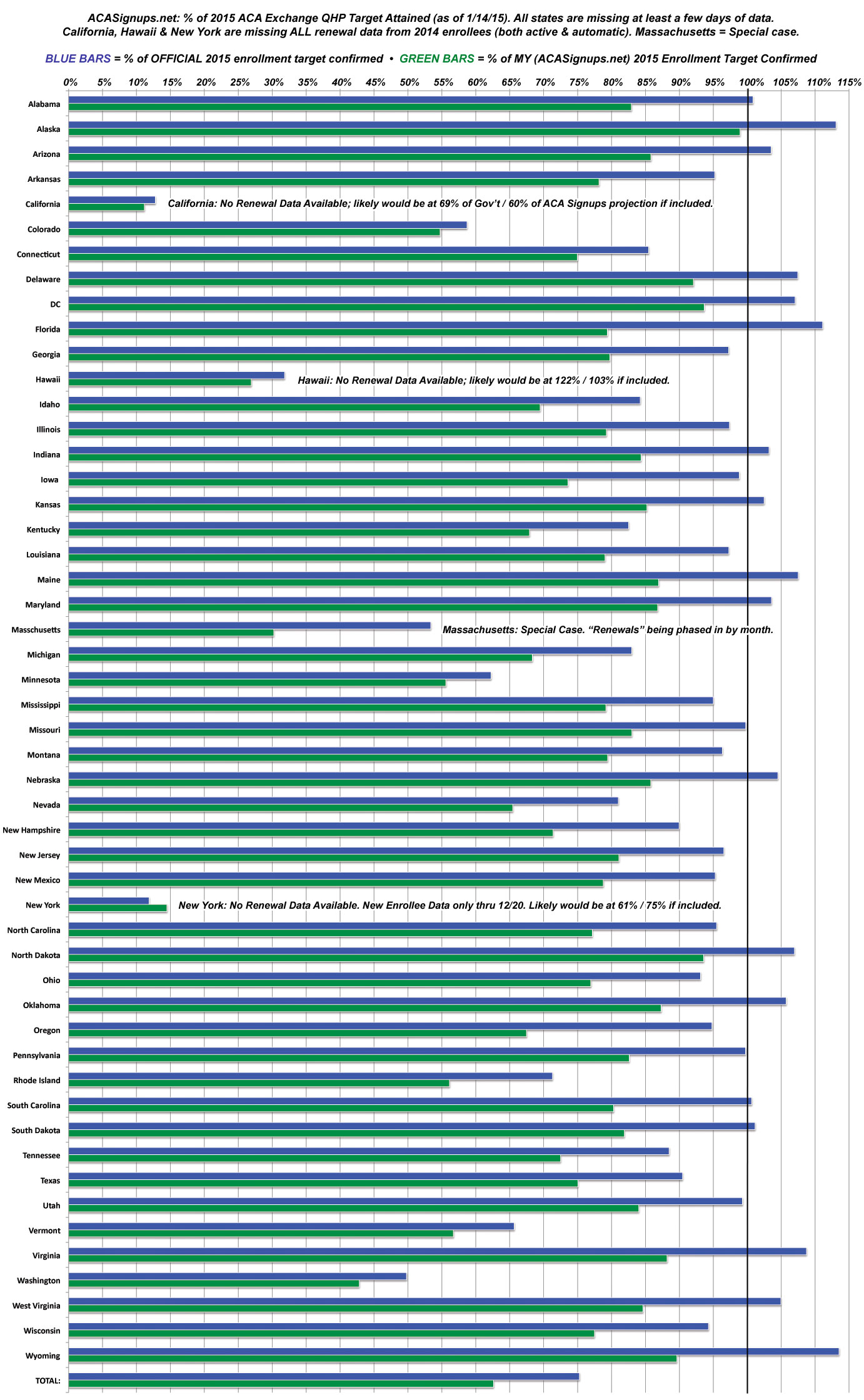 - Finally, aside from the 1.3 million estimated missing renewals, it's important to remember that there should be roughly 240,000 more QHPs scattered among all 50 states (+DC), which should mean that a few more states may have already nudged across the 100% mark already.