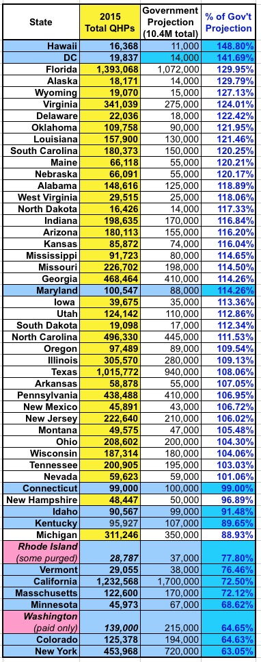 |   2015 QHP Selections vs. MY Targets: Not too different, excpet that Florida and New York have moved down and up respectively, as I've assigned both of them more reasonable targets. Washington State is bringing up the rear, partly due to their "paid enrollments only" policy...but even if they included total selections, I still doubt they'd be higher than 65%. |