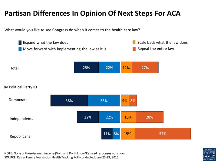 UPDATE 7/03/15: Thanks to Andrew Sprung for noting the comparison with KFF's exact same question back in January, when the results were 42% keep/expand vs. 46% repeal/scale back. That's a 12 point shift in 6 months; not bad!