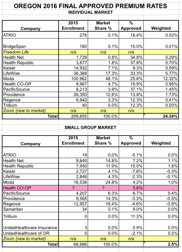 Oregon: Final 2016 Rate Hikes approved...24.2% weighted average increase, but...