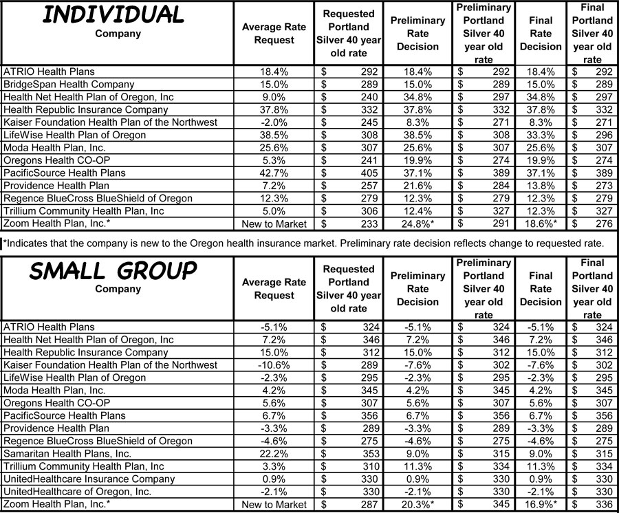 I went directly to the Oregon Insurance Division website and found the actual table which lists all of the individual companies, the requested rate changes and the final decisions, along with a sample premium listing for each (ie, a single 40-year old Silver plan for someone living in Portland) to give an idea of what a typical price change might mean: