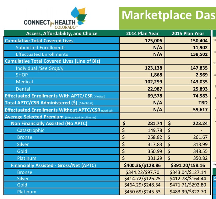 Colorado is one of the few ACA exchanges issuing monthly reports during the off-season. Until now, these reports, while chock full of data, have made it rather confusing to separate out the key number which I'm looking for: The cumulative number of 2015 QHP selections and the currently effectuated QHPs, because of their tendency to mix SHOP and Dental policies into the mix.