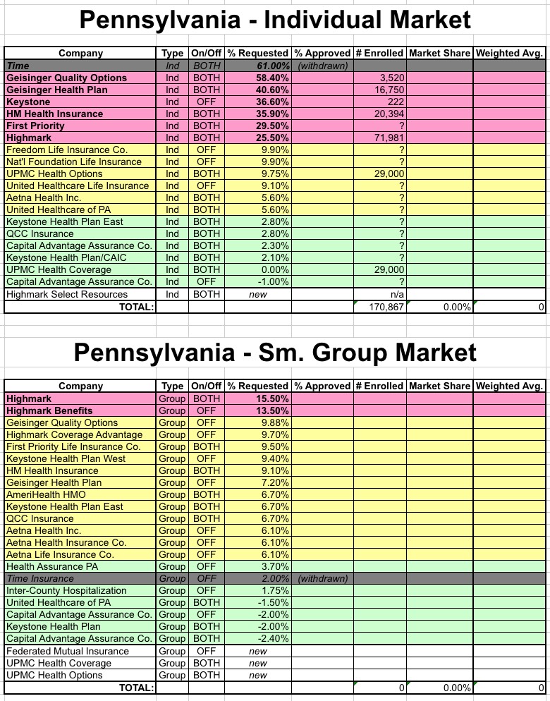 The total number of Pennsylvanians enrolled in effectuated policies as of 3/31 was 427,454, although it's likely up to around 436K by now (a 2% increase). However, I have no idea what the off-exchange total in PA is (it's likely around 340K, but that's a completely blind guess and could include people in "transitional" plans which aren't part of this rate pool anyway). As a result, I've given up on trying to calculate any sort of "weighted average" in Pennsylvania.