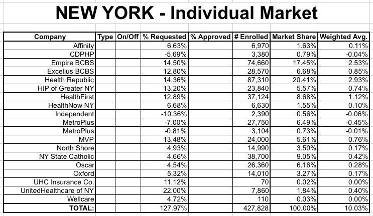 I've contacted the LOHUD reporter to see what's going on, but until I hear back from him, it looks very much like New York's weighted average requested rate increase is 10.0% even. Of course, even this could change after the state regulators go over them, as they did last year.