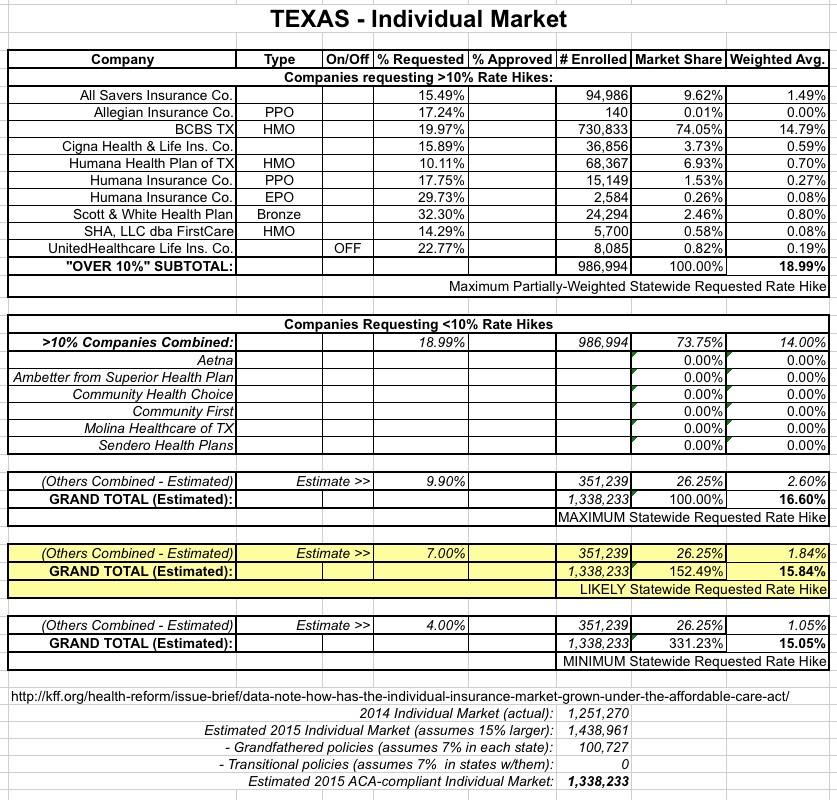 Again, the full explanation is included in the Missouri estimate, but to the best of my knowledge, it looks like the companies requesting rate increases higher than 10% come in at a weighted 19% increase, but only make up about 74% of the total ACA-compliant individual market, with the other 6 companies requesting increases of less than 10% (or possibly even decreases in some cases) make up the other 26%. Assuming this is accurate, the worst-case scenario for Texas would be around a 16.6% weighted average rate hike. The 6 "missing" companies likely range from 0 - 9.9%, so the more likely average is around 15.8%.