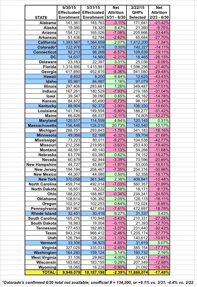 - Colorado's June number is listed as being identical to their March number because CMS was unable to verify their June enrollment and simply copied the March number over. Their unofficial June 30 figure is 134,200, or about 9.1% higher than it was on 3/31.