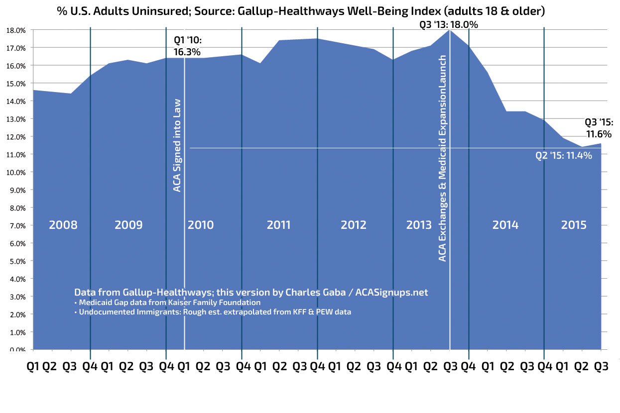 Aside from that, the other interesting tidbit from Young's piece is that apparently I missed the release of Gallup's 2015 3rd Quarter Uninsured Rate survey last week. This is the first quarter since the ACA Exchanges and Medicaid Expansion launched 2 years ago that Gallup has found the uninsured rate to increase (if only slightly), from 11.4% to 11.6%. However, even this isn't too unexpected: Last year, the rate held steady at 13.4% for the 2nd and 3rd quarters, since things are pretty stable during the off-season. This year, with Medicaid expansion pertty much tapped out, the uninsured rate was almost certain to remain flat at best between Q2 and Q3; it inching back up could simply be noise in the survey's margin of error. It should be back on the decline again starting soon, as 2016 Open Enrollment ramps up.