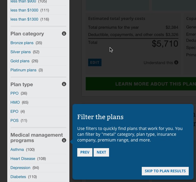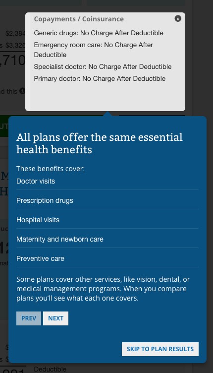 ...where they've added 4 new "Help Guides"...screen overlays to explain what the hell all of this stuff means (Copayments, Deductibles, Metal Levels and Out of Pocket vs. Premiums, as well as the Plan Filtering tool on the left sidebar):