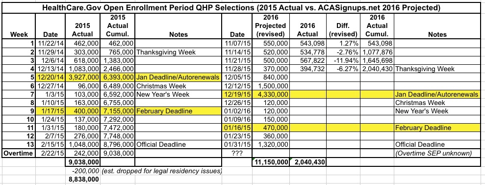 UPDATE 12/03/15: OK, strike that. This has been nagging at me all day. I'm bumping HC.gov Week Five projection up further to 840,000 for 11/29 - 12/05 (2.88 million cumulatively), or around 3.77 million nationally.