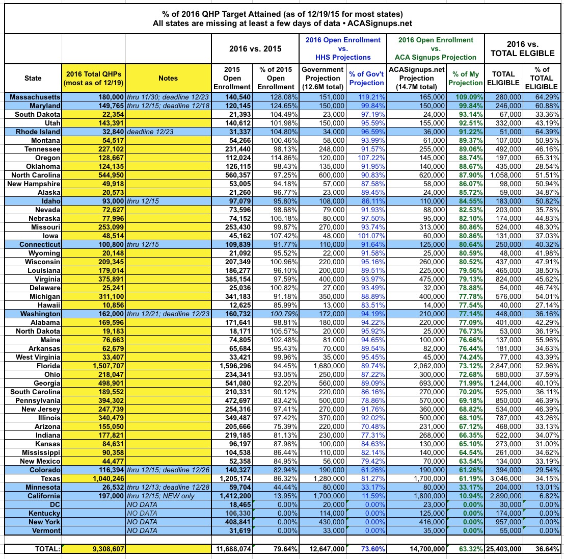 Overall, I've confirmed 9.3 million QHP selections nationally, but am pretty sure there's an additional 1.6 million already out there, likely as follows: