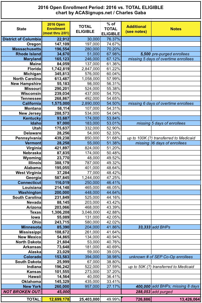 The three "M" exchanges (Minnesota, Maryland and Massachusetts) kicked some major ass this year, with each one enrolling more than 1/3 more people than 2015. Other strong performers (more than a 20% increase) were Oregon, Utah, Washington State, DC, Iowa and South Dakota, although Washington is a bit of a cheat since they actually did the reverse of HC.gov this year; they went from only counting paid enrollees to counting all selections. A true year/year comparison would likely be more like an 11% gain for WA.