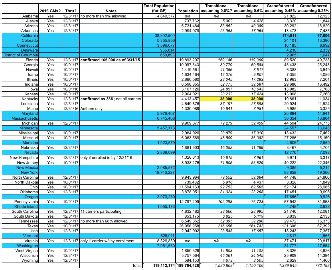 Based on these numbers, I've extrapolated out to estimate perhaps 1.1 - 1.6 million grandmothered (transitional) enrollees and 800K - 1.4 million grandfathered enrollees nationally.