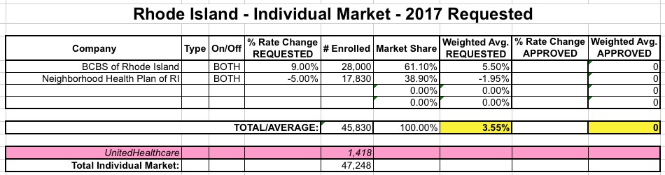 This is the first insurance carrier I've seen requesting a rate decrease for 2017. Unfortunately, I only know Neighborhood's on-exhange enrollee number (around 18,000 people), not their off-exchange number. I'll update the table accordingly if I'm able to find that.