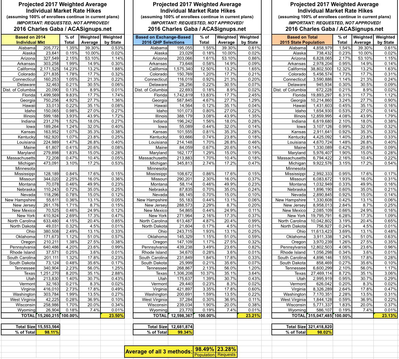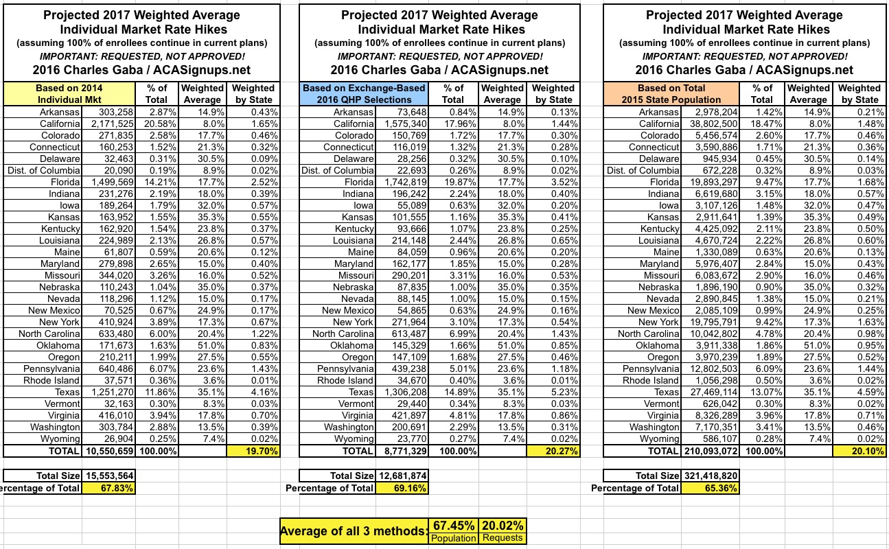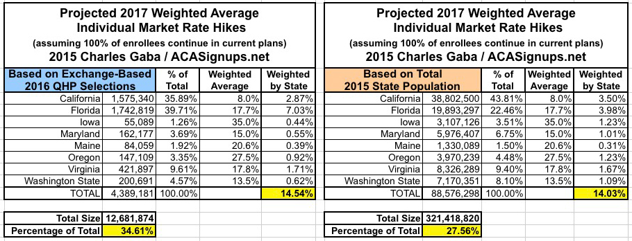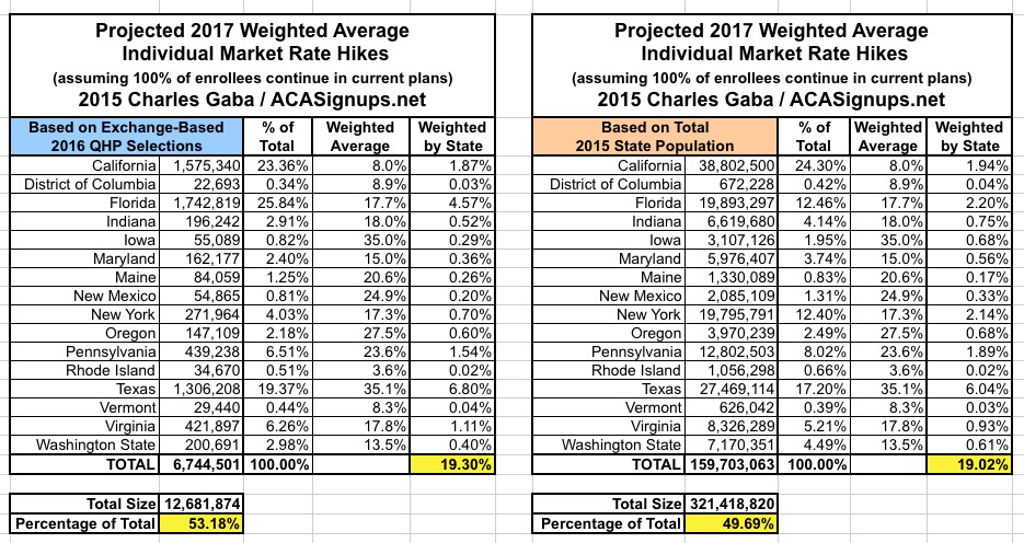 Since there are a lot of demographic variables which can skew the "average" up or down for any given state, last year I plugged the averages for each state into tables and weighted them based on 3 different criteria: The total (on plus off-exchange) individual market (based on 2014 data); the total exchange-based QHP selections as of the end of Open Enrollment; and the total population of each state. However, the 2014 data is too outdated by now (the national indy market has grown from around 15.6 million to around 20-21 million by now), so until the Kaiser Family Foundation or another trusted source compiles 2015 data, I'm dropping that method. Besides, all three methods still hovered in the same 12-13% range last year anyway.