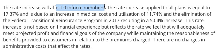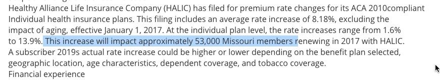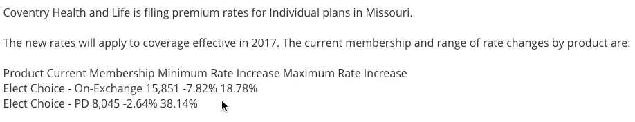 As you can see, not only is each Coventry product listed with a separate and unique "current membership" number, one of these (CareLink & FocustedCare HPN) overwhelms everything else in the state with over half a million members all by itself. I'm not sure what to make of this, but assuming these ratios are somehow accurate, Missouri is looking at roughly 16% average requested rate increases next year.