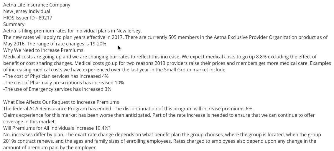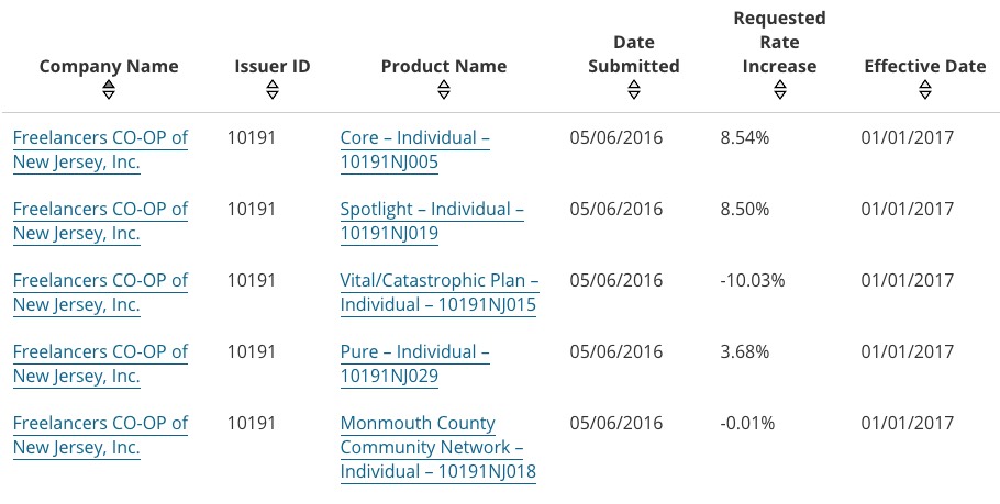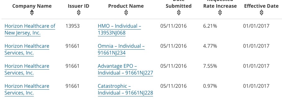 Yes, that's right...New Jersey appears to be among the very few states requesting average rate hikes of below 10% for 2017. This is mainly due to Horizon/BCBSNJ, which, unlike most other major carriers around the country is only asking for around a 6.2% average rate hike (again, this is a rough average based on the 4 filings below):