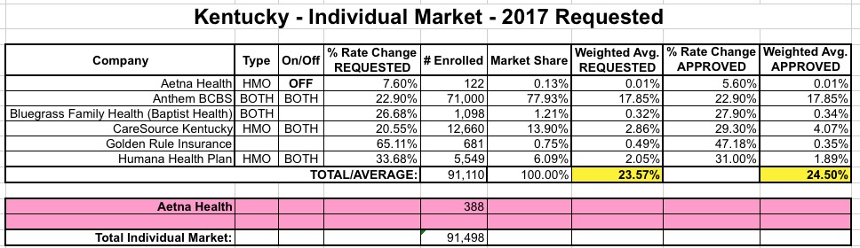 When I ran Kentucky's average requested rate hike numbers for the individual market back in May, I came up with a weighted average of 23.8%, but also cautioned that the weighting was likely based on less than 50% of the total ACA-compliant individual market state-wide.