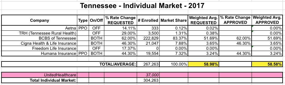 Tennessee: *Approved* 2017 rate hikes: 59%, state exchange market "Very Near Collapse"