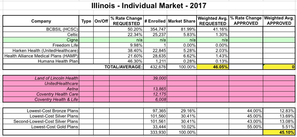 In the case of illinois, it's a little trickier. Unless I'm missing something, the only official notice the IL DOI has released is this PDF, which--while including lots of useful info about rating areas and so forth--doesn't actually list the overall statewide average approved rate increases by carrier.