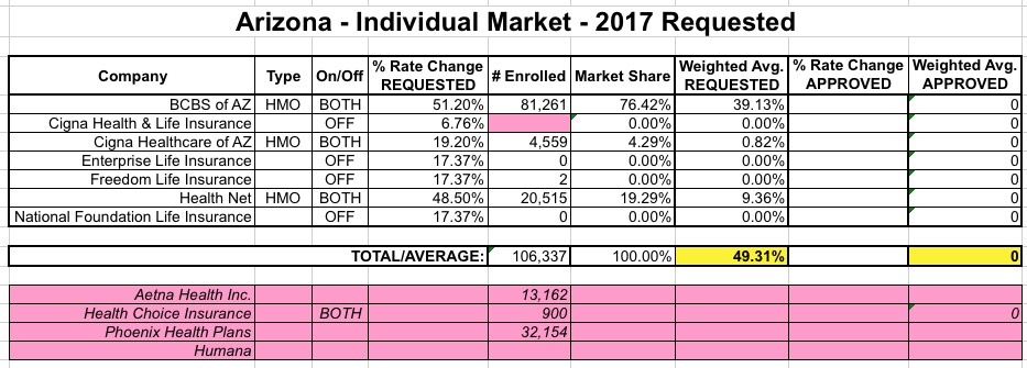 When I last crunched the numbers for the 2017 individual market in Arizona, the average requested rate hike statewide was a whopping 68%. However, that was before Aetna dropped their bombshell about dropping out of the exchanges in 11 states (AZ included), leaving about 6,400 residents receiving ACA tax credits in Pinal County with no subsidized policy options whatsoever.