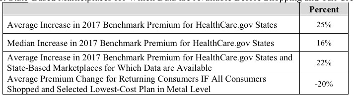 However, yesterday's press releases from the HHS Dept., along with the official ASPE Health Plan Choice and Premiums in the 2017 Health Insurance Marketplace report has caused a bit of understandable confusion. Kevin Drum over at Mother Jones mentions both ASPE's 22% figure along with my own 25% estimate:
