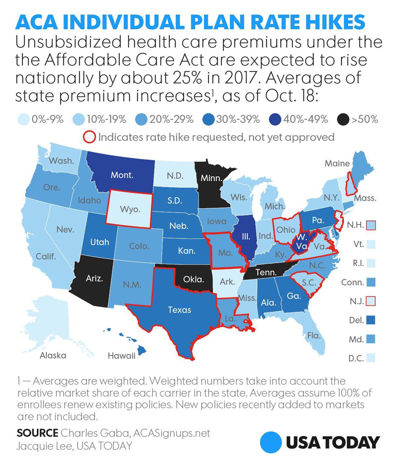 Premiums have skyrocketed across the nation, with a national average of almost 25%, with some states experiencing rate increases up to 70%. In Iowa, one plan got a 43% increase approved. In Florida, the individual market will see an average rate increase of 19%. In Pennsylvania, at least three plans requested rate increases over 40%. And the average rate requested in Minnesota is 54%. [ACA Signups], [Health Insurance], [Miami Herald], [Health Insurance]