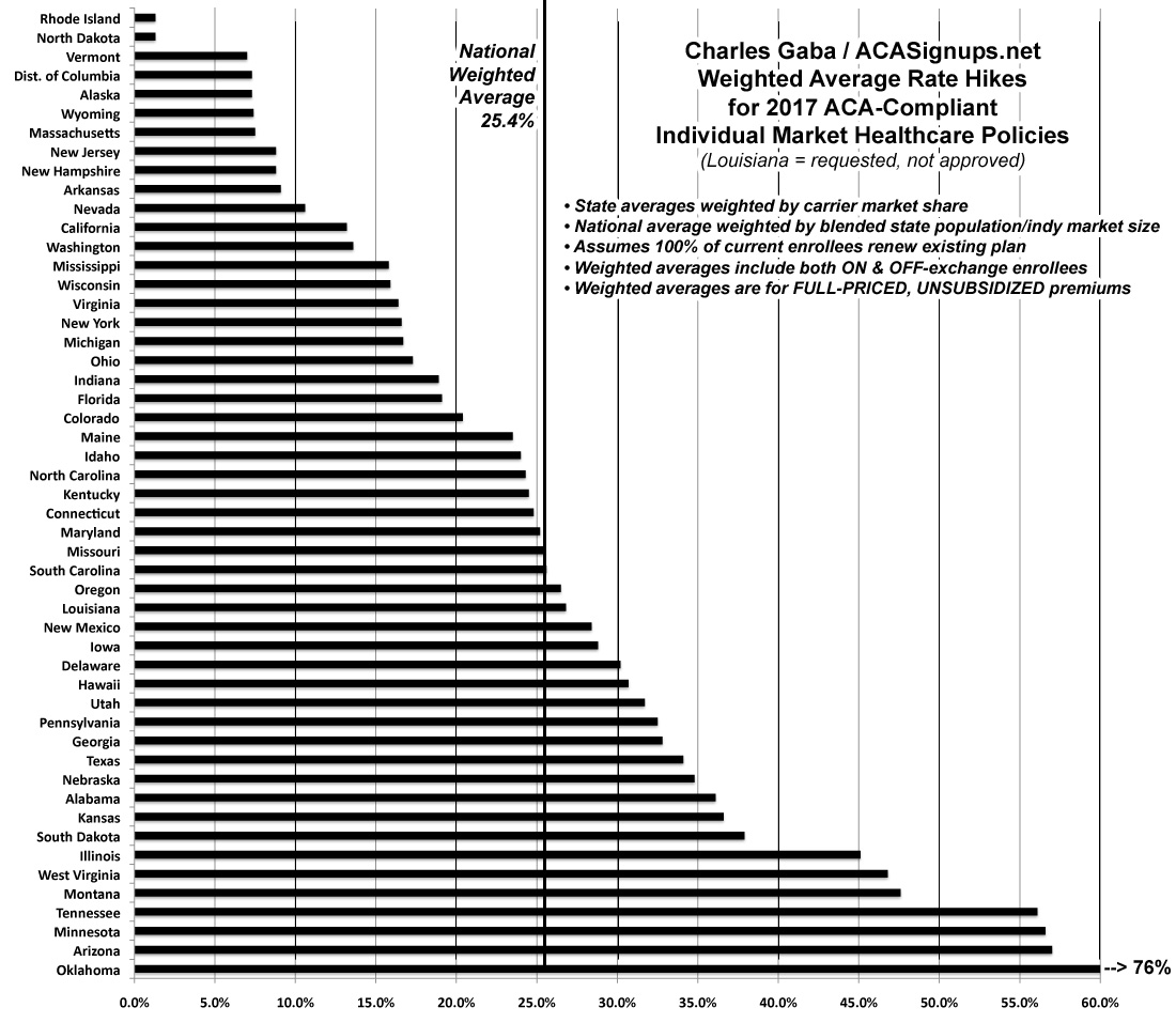 At the opposite end, unfortunately, are 17 states averaging unsubsidized rate increases higher than 30%...seven of which are over 40%: Illinois, West Virginia, Montana, Tennessee, Minnesota, Arizona and especially Oklahoma, which literally runs off the chart at a whopping 76% for the sole indy market carrier in the state, Blue Cross Blue Shield of OK: