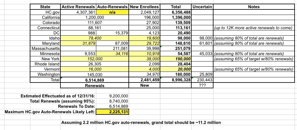 Let's assume I'm correct that there's only 9.2 million effectuated enrollees nationally at the moment, and that 95% of them end up renewing, either actively or passively (auto-renewals). That's 8.74 million total renewals. Of those, I've already accounted for about 6.52 million, which leaves only 2.22 million more to be plugged into the HC.gov states.