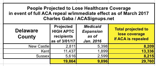 In Delaware, assuming 30,000 people enroll in private exchange policies by the end of January, I estimate around 20,000 of them would be forced off of their private policy upon an immediate-effect full ACA repeal, plus another 10,000 enrolled in the ACA Medicaid expansion program (PPT), for a total of 30,000 residents kicked to the curb.