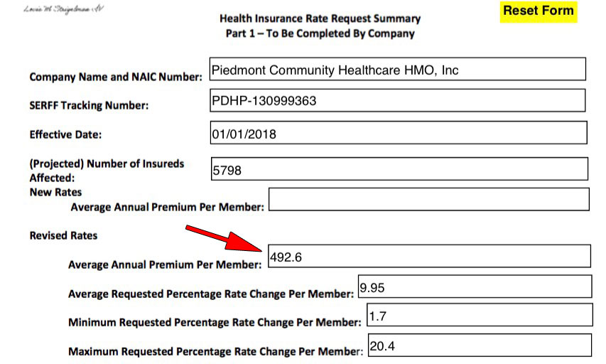 This concern was made worse by Piedmont's filing. Their covered lives number seems right (5,798)...but look at their "Average Annual Premium per Member" of only $492.60?? Remember, this is the unsubsidized price. I find it hard to believe this is the annual total...either there's a missing number or this is the monthly average premium.