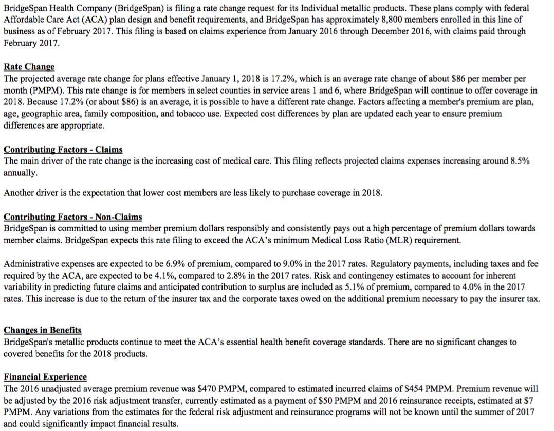 BridgeSpan is also pretty candid about breaking out their increase justification, including an important sentence which David Anderson called to my attention: "Another driver is the expectation that lower cost members are less likely to purchase coverage in 2018."