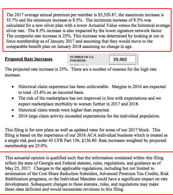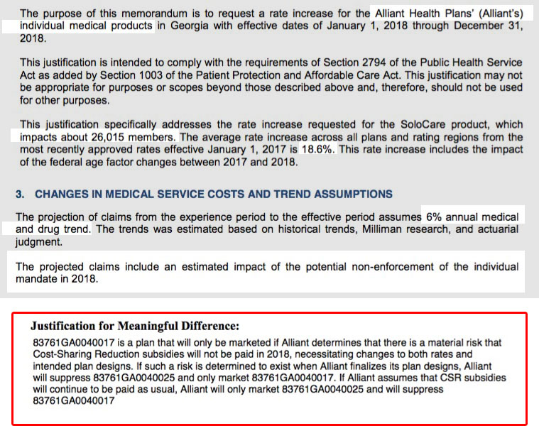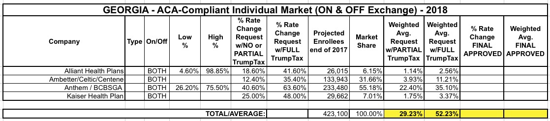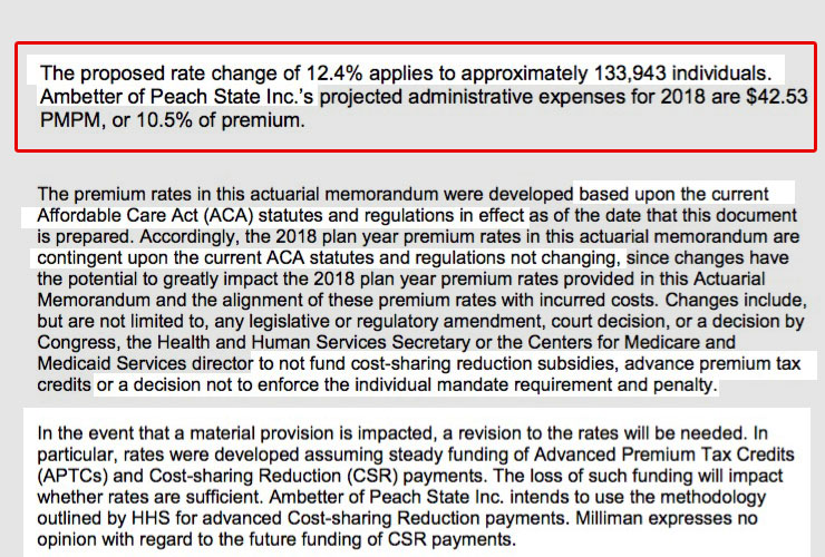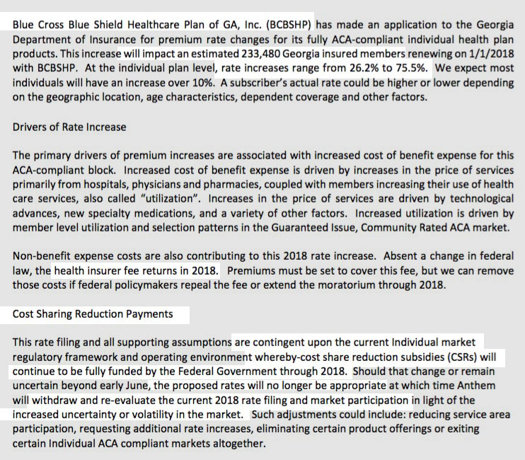 As for the "FULL Trump Tax" variant, the Kaiser Family Foundation estimates that in Georgia specifically, cutting off CSR payments would require an additional 23 point rate hike next year, assuming none of the 4 carriers dropped participation altogether. Added on top of the 29.2% "no/partial sabotage" increase, that would come to an ugly 52.2% requested rate increase. Ouch.