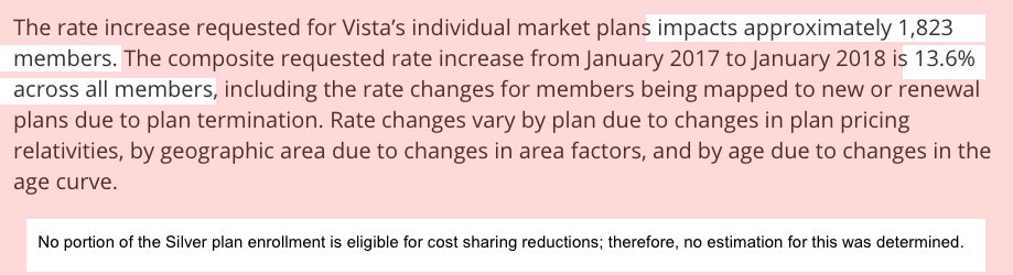 Anyway, I've managed to plug in one hard request percent for each carrier--the FULL Trump Tax for 3 of them, the NO/PARTIAL Trump Tax for most. In Vista's case, they're off-exchange only so the CSR issue isn't a factor anyway. Unfortunately, I can't seem to find the enrollment number for Community Health Choice, so I don't know what their share of the market is, which could make a big difference if they have high enrollment. I've plugged in a flat 100,000 enrollees for the moment, but will change that if I'm able to track the actual number down.