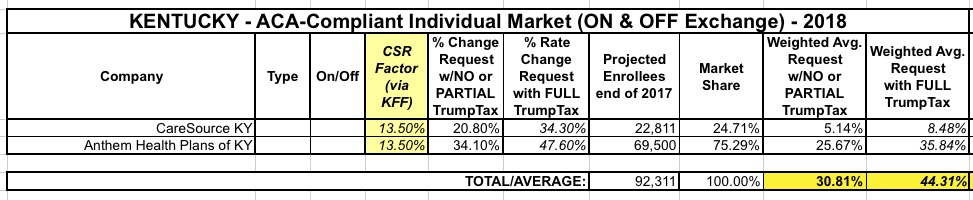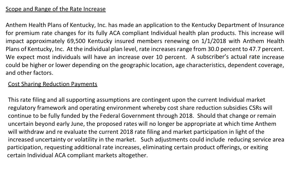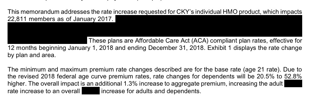 Louise Norris gave me a heads up that the Kentucky Insurance Dept. has posted their 2018 rate hike filings as well. The individual market is pretty straightforward...and pretty grim: Both individual market carriers, CareSource and Anthem, are asking for pretty steep rate hikes even if CSR payments are locked in next year, averaging around 30.8%, while assuming another 13.5 points on top of that (71% of Kaiser's 19% Silver average) would bring the average up to around 44.3%. Not much else to say about this one for the moment.
