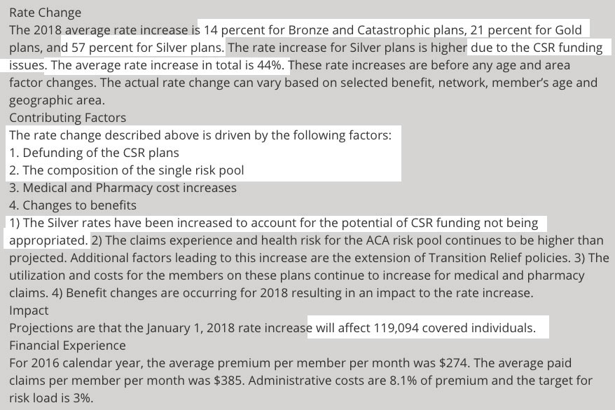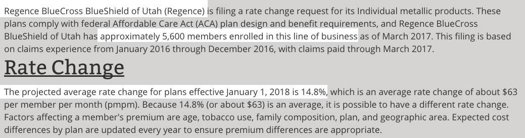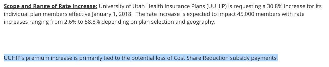 These are also the only two carriers which are impacted by the Cost Sharing Reduction issue, but it makes a pretty significant difference: Both SelectHealth and University of Utah specifically list CSR reimbursements as the primary reason for their rate hikes. They didn't give hard numbers, but according to the Kaiser Family Foundation, 15 points of the Silver rate hikes are due to CSRs; spread out across all metal levels, that translates into roughly 10.9%.