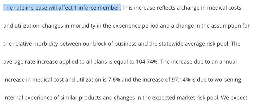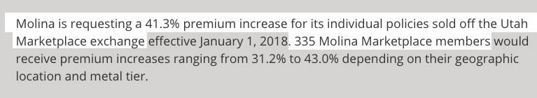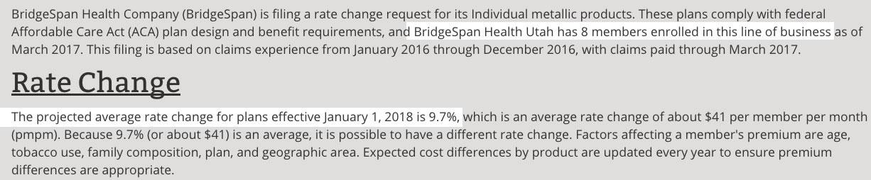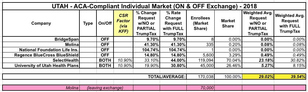 Utah has also finally released their requested 2018 individual market rate increases. There are six carriers offering individual policies next year, but only 2 of them are participating on the ACA exchange (and the 4 off-exchange carriers hold less than 4% of the total market combined). In fact, two of the off-exchange-only carriers are barely participating at all: BridgeSpan has only 8 enrollees, while "National Foundation" (a "phantom carrier" which also goes by "Freedom Life" in other states) once again supposedly only has a single "enrollee". Molina has a few hundred off-exchange enrollees, but the bulk of their 70,000-person membership are in exchange-based policies, and they're dropping off the exchange next year, so those 70K will have to choose from one of the two remaining exchange carriers: SelectHealth and the University of Utah.