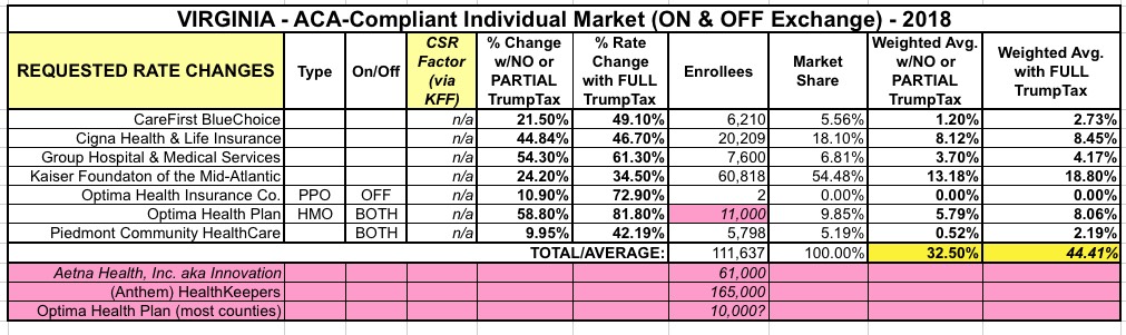 Virginia was the very first state whose 2018 rate filings I analyzed, way back in early May. At the time, the initial filings amounted to 9 carriers on the individual market with an average rate increase request of around 30%. At the time I hadn't started distinguishing between "with CSR payments" or "without CSR payments", so I don't really know which scenario that 30% reflected; it was probably a mix of both depending on the carrier. 61,000 Aetna enrollees would have to shop around for a new carrier since they had previously announced they were pulling out of the individual market.