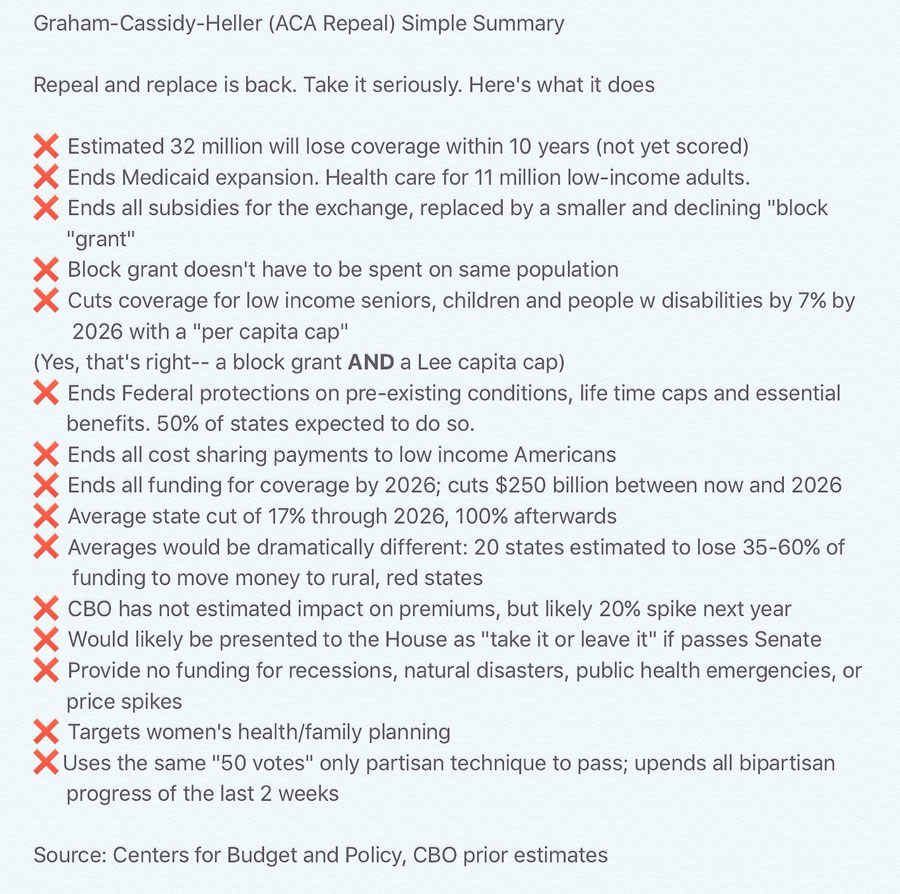 - SECOND: On a related note, Bill "so much for the Jimmy Kimmel test!" Cassidy and Lindsey Graham are still trying to cram through their pile-of-garbage Hal Mary Trumpcare bill, which is at least as bad as the GOP's failed AHCA/BCRAP bills were earlier this year and even worse in some ways. Again, there's only 17 days left to pull it off, but remember what happened with AHCA last spring...anything's possible. Here's a summary of the impact of the Cassidy-Graham bill via Andy Slavitt and the Centers for Budget & Policy:
