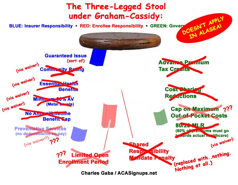 It's time to once again dust off the Three-Legged Stool visual aid to help explain just what the Graham-Cassidy bill would do to the individual insurance market. It's important to note that none of this has anything to do with Medicaid (expansion or traditional), the group market, Medicare and so forth; just the individual market.