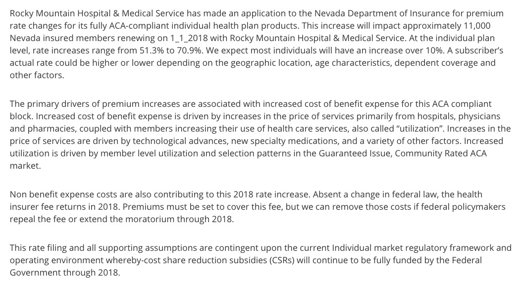 Four of the six individual market carriers are off-exchange only, so the CSR reimbursement issue is a non-factor for them. That leaves two carriers (Health Plan of NV and HMO Nevada), both of which seem to be operating on the assumption that CSRs will continue to be paid. This means that the 28.9% and 60.3% average rate hikes being requested by each would be around 10 points higher if CSRs aren't paid next year (spread across all metal levels), for an ugly statewide rate increase of either 37.8% with CSRs or 44.4% without them.