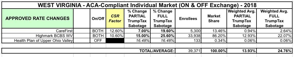In August I reported that the three individual market carriers in West Virginia (CareFirst, Highmark BCBS and Health Plan of the Upper Ohio Valley) were requesting average rate hikes of around 17.8% assuming CSR payments are made or 27.8% assuming they aren't.