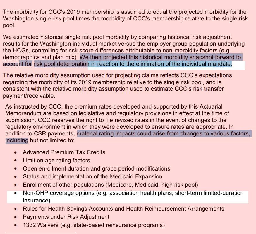 ...and so on. You get the idea. The Urban Institute analysis projected that the one-two sabotage combination of individual mandate repeal + #ShortAssPlans are responsible for a combined 21% average premium increase in Washington State. If accurate, that suggests that absent these factors, premiums would actually drop by about 2% next year.