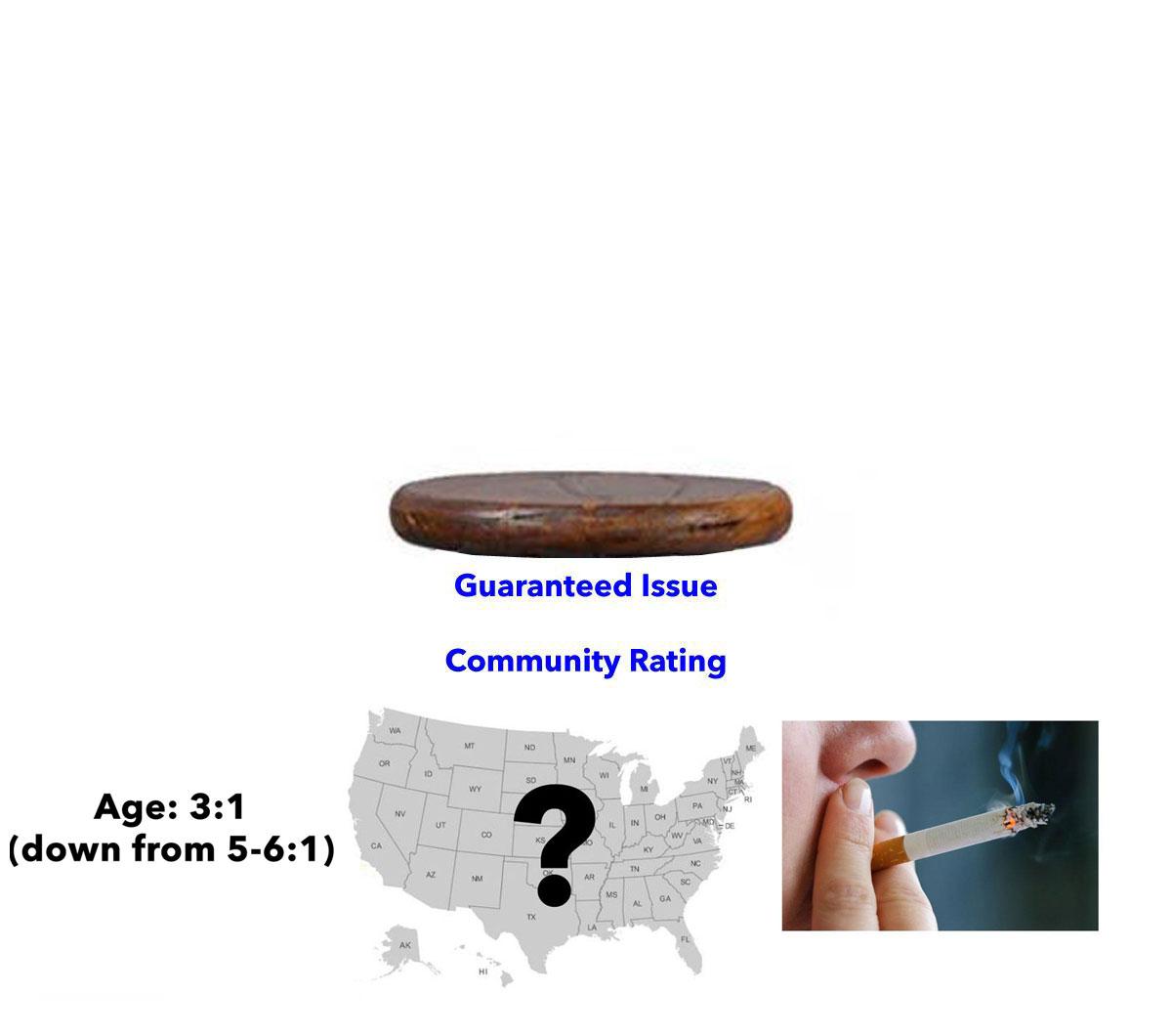 Related to this, the carriers could no longer discriminate against anyone based on their medical condition or gender by charging more for the same policy; this is known as COMMUNITY RATING. The only price variations allowed are age (a 3:1 range…down from 5 or 6:1), where they live…and whether they smoke or not; that's the only behavioral surcharge that's still allowed.