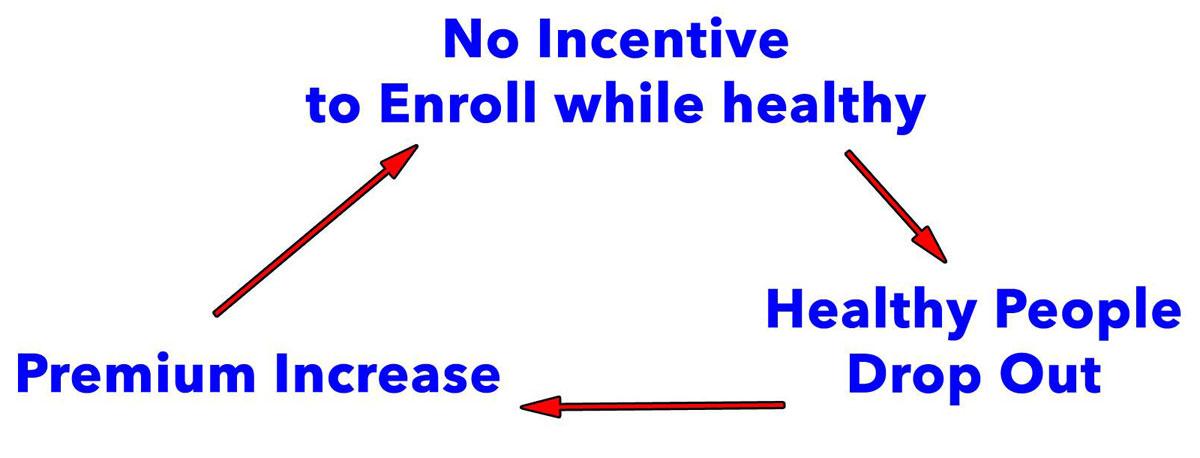 If anyone can sign up for coverage whenever they want to, and there's no negative consequence for not doing so, healthy people have a tendency to not bother signing up as long as they stay healthy…but then to do so the moment they're diagnosed with a serious ailment or they're seriously injured.